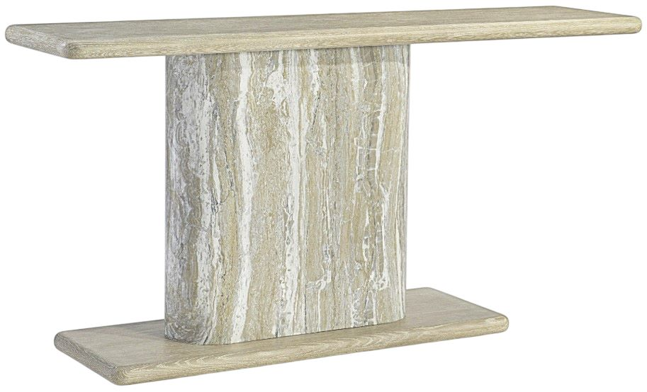 Organic drama is the signature of the Arcadia console table, with a monolithic faux stone pedestal base in kalta finish. The column supports a cantilevered wire-brushed oak top in clay finish and rests on a matching wood base.Read More