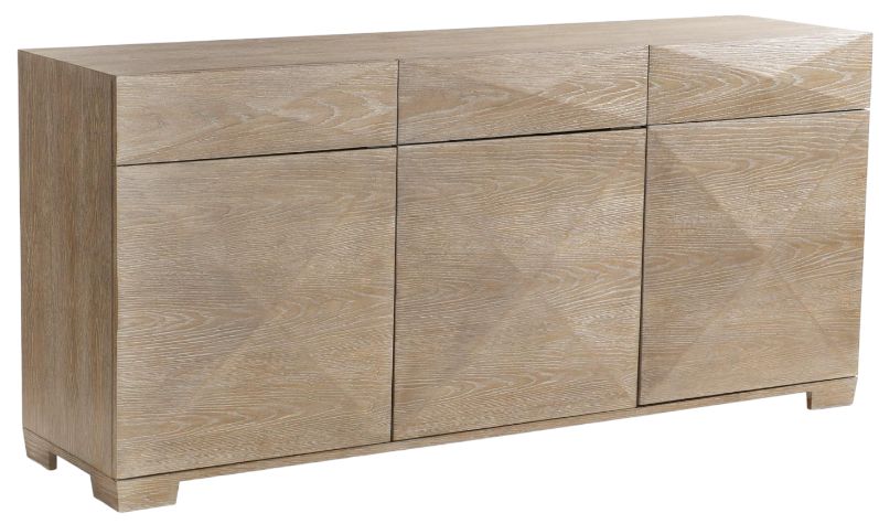 Dimensional pyramid shaping draws all eyes to the Aventura buffet. Three push-to-open drawers and three soft-close doors offer ample storage, and behind the doors are adjustable and removable shelves. A Marcona finish adds a chic but rustic look as the perfect final touch.Read More