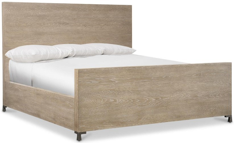 Simple lines craft a quietly sophisticated look on the Aventura panel bed. Inspired by relaxed California style, the wood grain shines through the Marcona finish. Cast metal feet in a Frosted Nickel finish support the headboard and footboard for a chic rustic detail.Read More