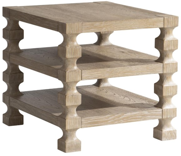 The Aventura side table is highlighted by uniquely shaped cast resin posts that support the top and two shelves, while also visible on the top's surface. The open-back design is finished in a warm and rustic Marcona.Read More
