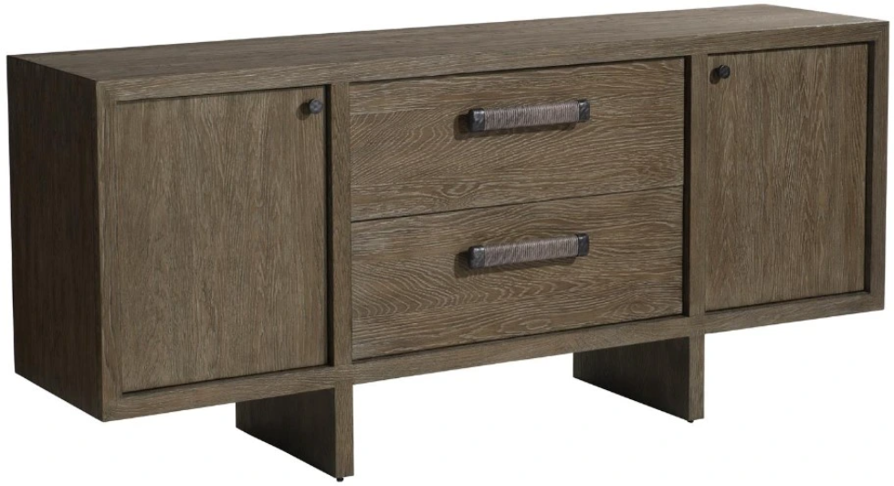 Texture and dimension carve a signature look onto the Casa Paros sideboard. Three cast resin faux concrete soft-close doors are refined in Bedrock finish. The top and splayed legs feature warm Playa finish, and a bottom shelf is also finished in Bedrock. Behind each door are adjustable and removable shelves.Read More