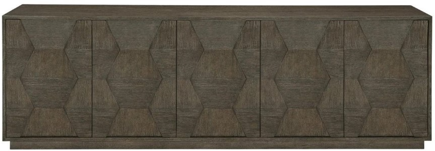 The Linea entertainment console merges form and function with flawless artistry. Wire-brushed oak veneers in a cerused charcoal finish offer subtle textures, while an eye-catching faceted veneer design adds dimension. The absence of hardware on the five push-to-open doors contributes to the clean, streamlined look.Read More