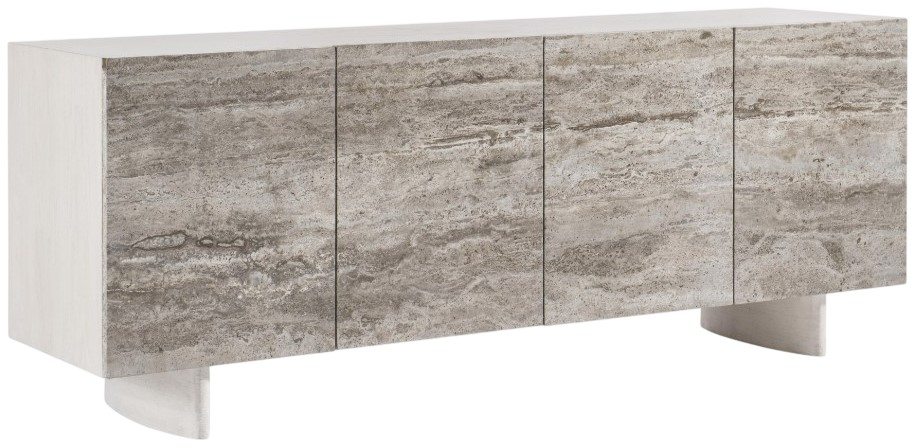 The luminous beauty of stone and textural wood are beautifully balanced in the Sereno entertainment credenza. The top and sides are crafted in walnut with a lutra finish, while the four doors gleam in silver travertine fronts. The modern organic design is finished with two cast resin legs with a faux stone texture.Read More