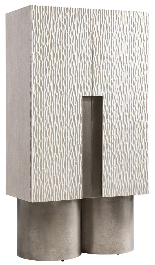 The bauhaus influence is clear in Solaria bar cabinet, showcasing simplicity, elegance, and geometrical shapes. Two doors feature a cascading chiseled pattern in cast resin with a weathered bone finish and inset cast aluminum plates in a nickel finish. Circle shapes crafted from cast aluminum create a base, also in the nickel finish.Read More