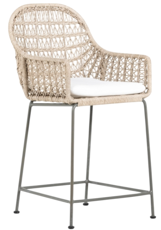 Clean, contemporary shaping and an updated weave transform all-weather wicker into something modern. This high-texture bar stool is supported by a contrasting bronzed iron base, with a white seat cushion for comfort.Read More