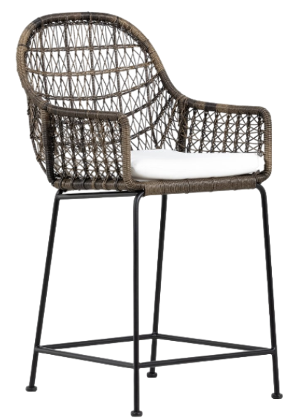 Clean, contemporary shaping and an updated weave transform all-weather wicker into something modern. This high-texture bar stool is supported by a contrasting black iron base, with a white seat cushion for comfort. Cover or store indoors during inclement weather and when not in use.Read More