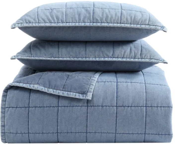 As easy as tugging on your favorite broken-in jeans, the Stonewashed Denim Quilt Set settles over the bed with effortless calm. Each square of its box-stitched, stonewashed denim front is softly broken-in, while the reverse—pure cotton with a brushed hand—rests gentle as a cottonwood puff against your skin.Read More