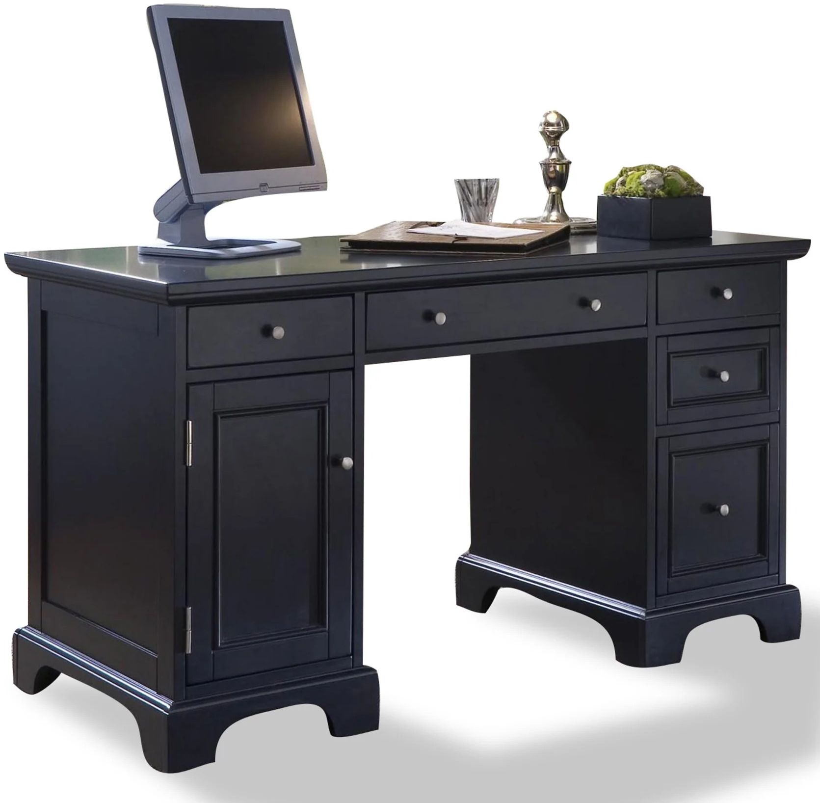 homestyles pedestal desk is constructed of solid hardwood and engineered wood in a black finish. Features include two utility drawers and file drawer for legal or letter files on the right side. The left side features a CPU compartment with shelf and utility drawer. The center features a drawer with a drop down front that can function as a drawer or keyboard tray.