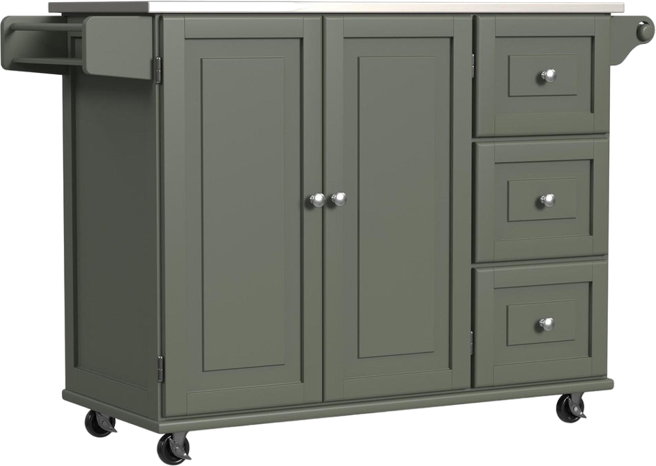 Maximize the storage space and work surface in your kitchen with this Dolly Madison Kitchen Cart by Homestyles. The stainless steel surface sits atop a sage green, durable engineered wood frame, which can be easily moved throughout your space on lockable casters to bring convenience right where it's needed most.Read More