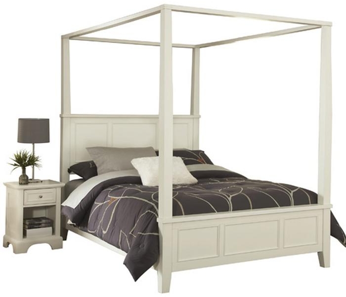 Unadorned details such as the straight and curved lines, and slightly flared legs create the contemporary style of the Naples Queen Canopy Bed and Nightstand by homestyles. This set is constructed of hardwood solids and engineered wood in a smooth, white finish. Bed features include raised panels on the headboard and footboard. Nightstand features one storage drawer and one open storage area. Brushed nickel hardware. Bed Size: 63.5w 88d 81.25h. Nightstand Size: 18w 16d 24h.