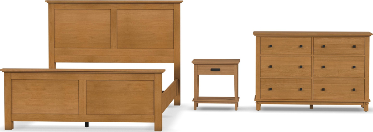 The headboard and footboard feature a timeless double panel design. The nightstand has a single drawer and an open lower storage area. The dresser's top two drawers have a felt-lined bottom in each for delicate items, and four lower drawers provide deep storage for clothing. Stained in a light oak finish, this craftsman-style bedroom set will fit right in with your existing furniture, or help you create a new look.
