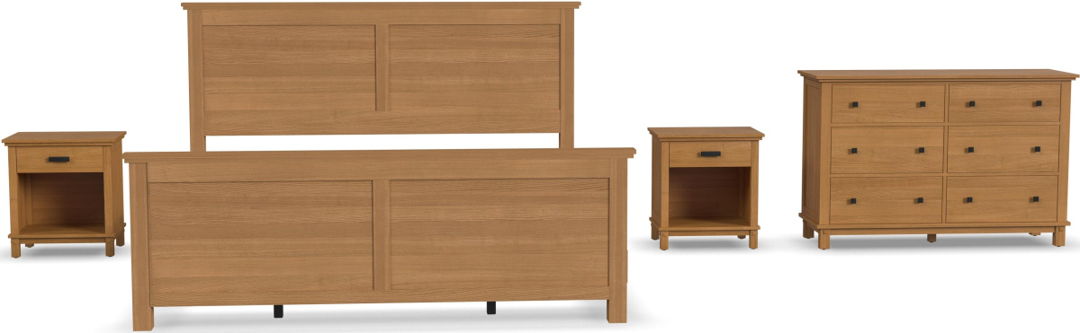 The headboard and footboard feature a timeless double panel design. The nightstands have a single drawer with a lower storage area. The dresser's top two drawers have a felt-lined bottom in each for delicate items, and four lower drawers provide deep storage for clothing. Stained in a light oak finish, this craftsman-style bedroom set will fit right in with existing furniture, or help you create a new look.