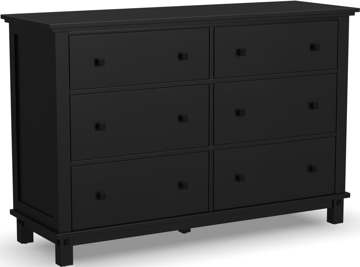 Six drawers keep your space organized and tidy, four with ample space for clothing and two smaller, felt-lined drawers for more delicate items. Elegant, square black pulls give this dresser a modern look. While the classic black, painted finish enables this dresser to pair well with many styles and décor.