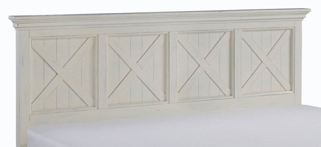 Rustic weathered wood and a signature X-frame mark the cottage feel of the Seaside King Headboard by homestyles. Crafted of wire-brushed solid mahogany and mahogany veneer panels in a hand-rubbed white finish. Inset panels feature an X-frame design. Holes are provided to attach to most king or California king bed frames. Hardware is not included.