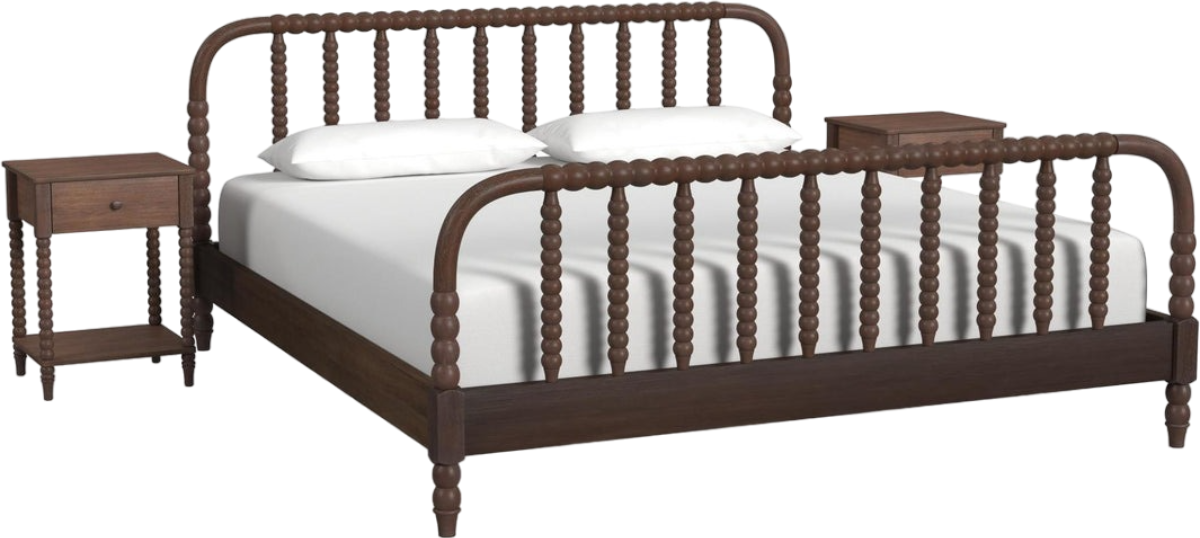 Add some ornate flair to a master suite or guest bedroom with the Spindle Queen Bed Set from Homestyles. Carefully crafted from solid mahogany wood and veneers, this Queen bed and pair of nightstands features a rich, antiqued coffee brown stain that adds sophisticated warmth to more traditional bedrooms. Elaborately turned accents make a statement in the room, and the nightstands each contain a drawer for functional storage.Read More