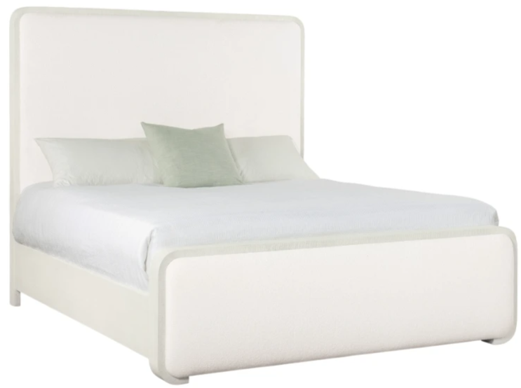 Create a tranquil bedroom retreat in a soft creamy white palette and soft silhouette with the Serenity Ashore King upholstered bed. This striking bed combines the Artic performance fabric on the upholstered headboard with the Sand Dollar white lacquered glasscloth border on the headboard and a grasscloth footboard and side rails.Read More