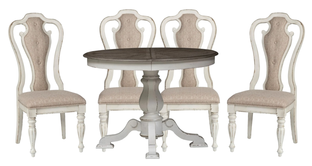 Create a grand gathering with the Magnolia Manor optional five-piece pedestal table set, consisting of four splat back upholstered side chairs and a pedestal table. Crafted of poplar solids with cathedral white oak veneer, this kit features an antique white finish with heavy chipping and a weathered brown top with whitewash.Read More