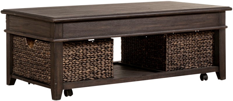 Wow family and friends and utilize the convenience of the lift top on this cocktail table, making working on your laptop or enjoying a snack more comfortable. There is a center storage compartment beneath the lift top. A large open bottom shelf is complete with two Sea Grass Rope baskets for additional storage. Bead molding runs along the center of the table to give it a distinct style and block legs flow into tapered feet to catch the eye. Casters make this table easily moveable when needed. The Mill Creek lift top cocktail table offers lots of function in a classic, timeless design.