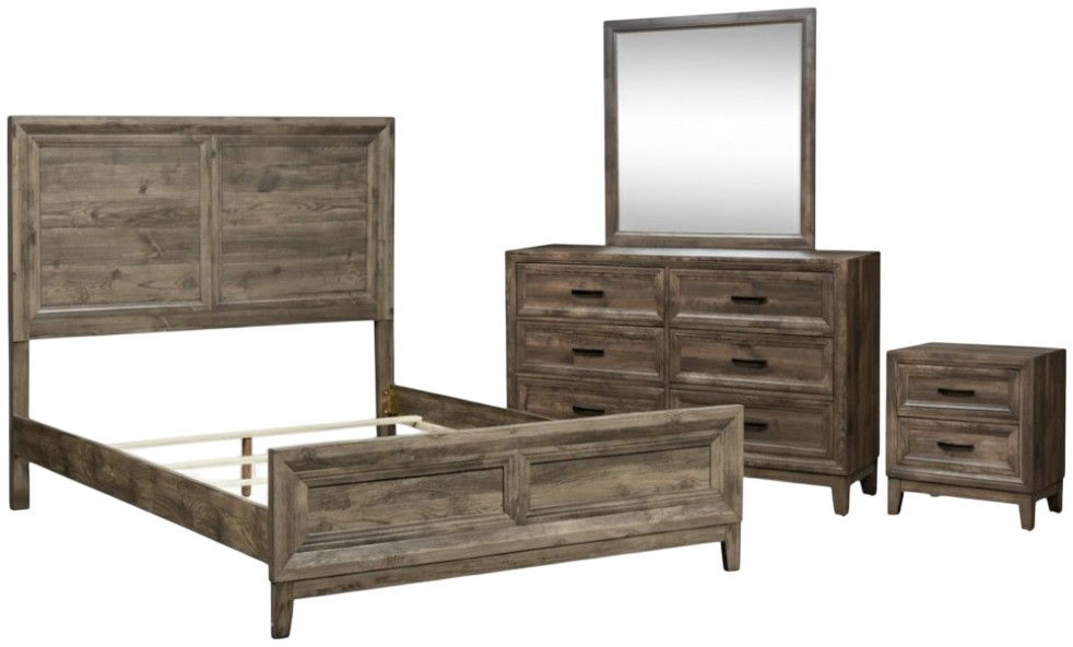 Enhance your home with the Ridgecrest queen panel bed, dresser, mirror, and nightstand. Crafted of rubberwood solids with paper laminate, this kit features a cobblestone finish, picture frame cases, tapered feet, drawer fronts with canted moldings, paper laminate drawer interiors, and is accented with antique brass bar pull hardware.Read More