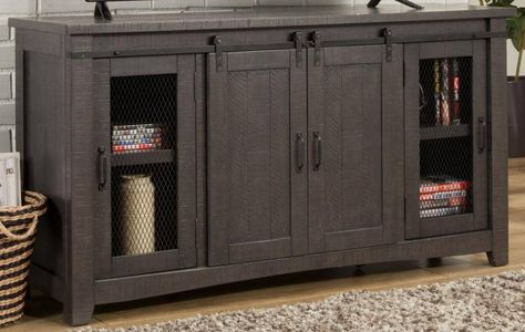 This beautiful TV console is made from roughhewn and distressed solid pine and pine veneers. Comfortable and casual farmhouse look is spot on for today's consumer. The unique barn doors roll smoothly along iron forged-style bands.Read More