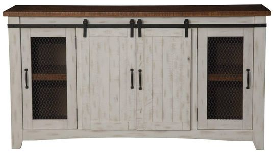 This beautiful TV console is made from roughhewn and distressed solid pine and pine veneers. Comfortable and casual farmhouse look is spot on for today's consumer. The unique barn doors roll smoothly along iron forged-style bands.Read More