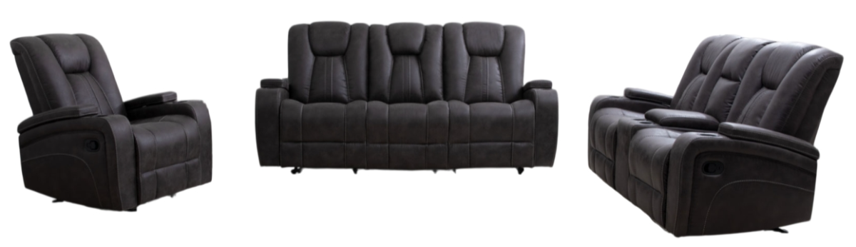 3-Piece Ensemble: 3-Piece Set includes the Marlow Charcoal Manual Reclining Sofa, Marlow Charcoal Manual Reclining Console Loveseat and Marlow Charcoal Manual Recliner. Each item also sold separately.