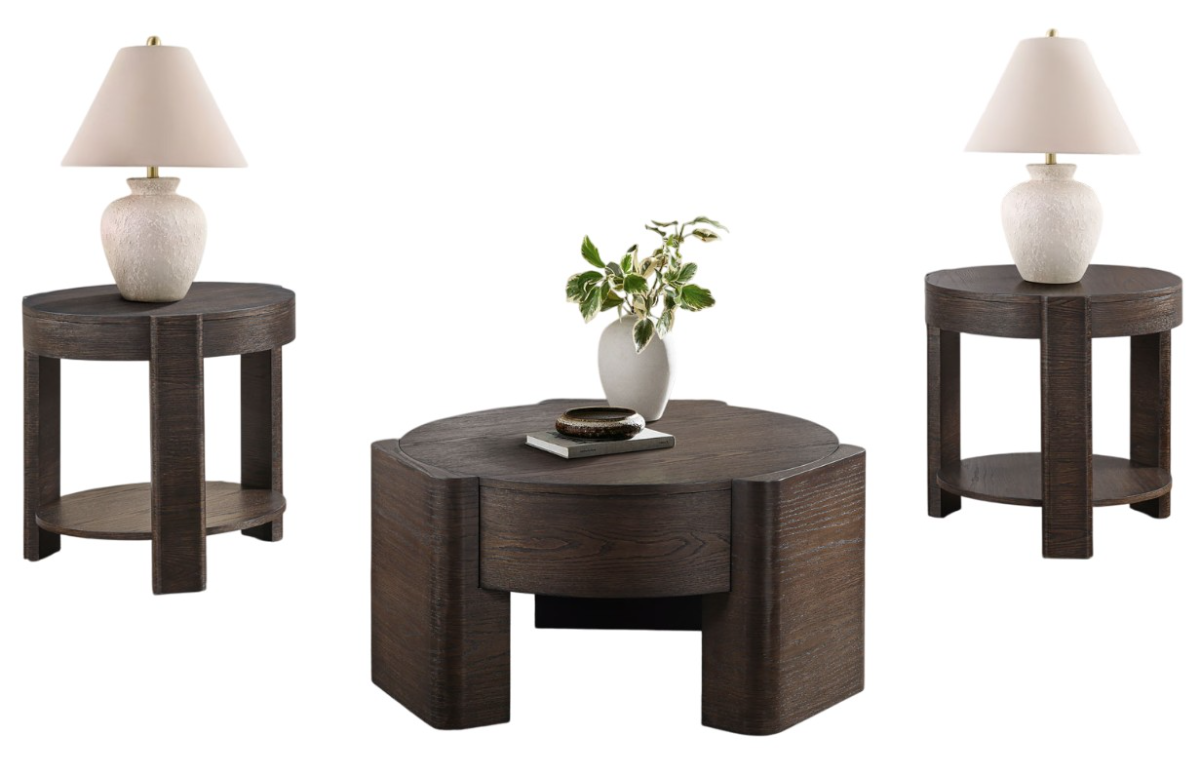 Modernly elegant with flowing round shapes, the Salina 3-Piece Table Set completes any room with stunning table accents. Crafted from oak veneers and solid Asian hardwoods in a warm espresso finish, the set includes a 32.5″ round coffee table with hidden casters and two matching end tables.Read More
